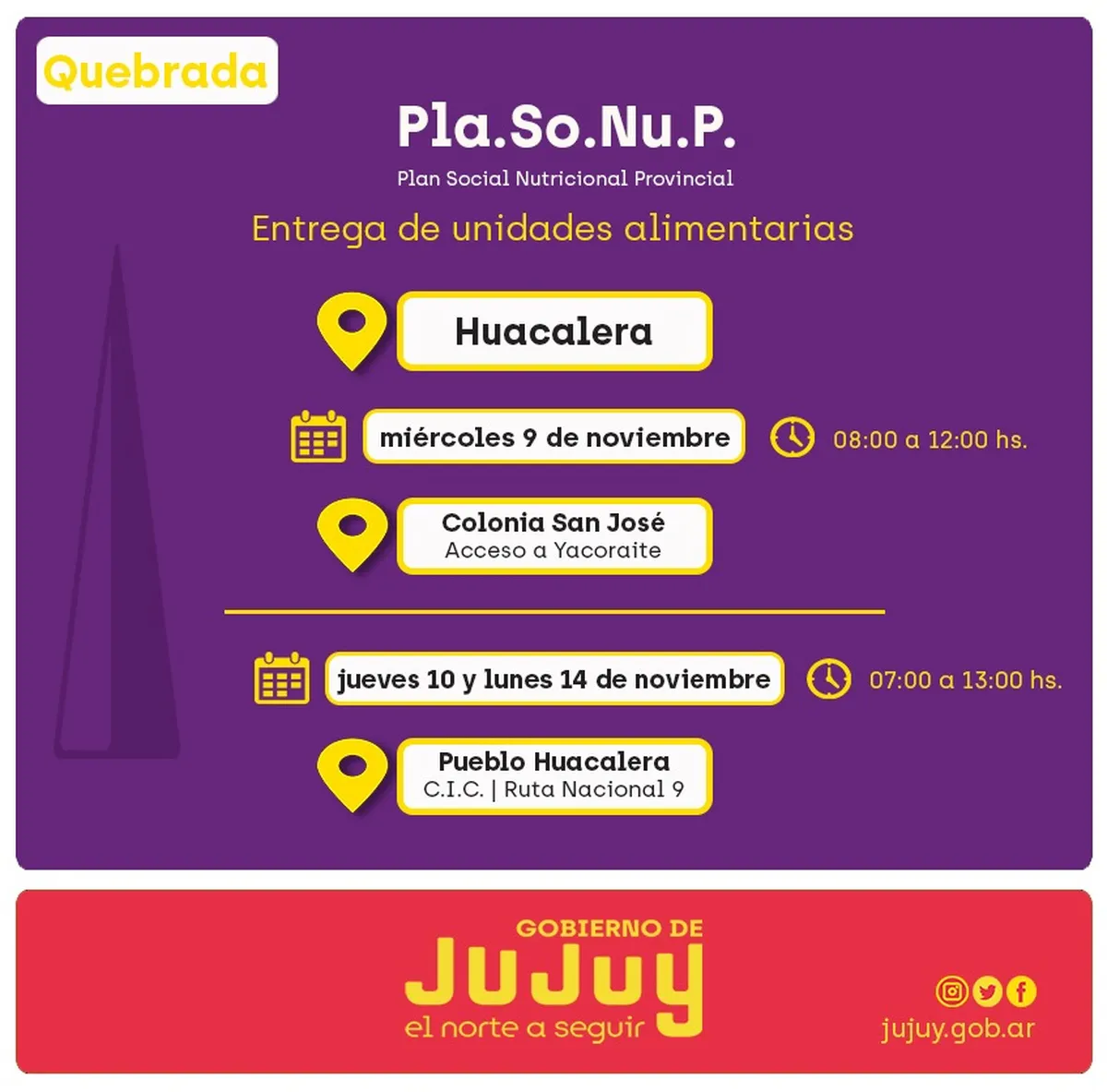 Miércoles 09 de noviembre, en Colonia San José, en el acceso a Yacoraite, en el horario de 08:00 a 12:00.