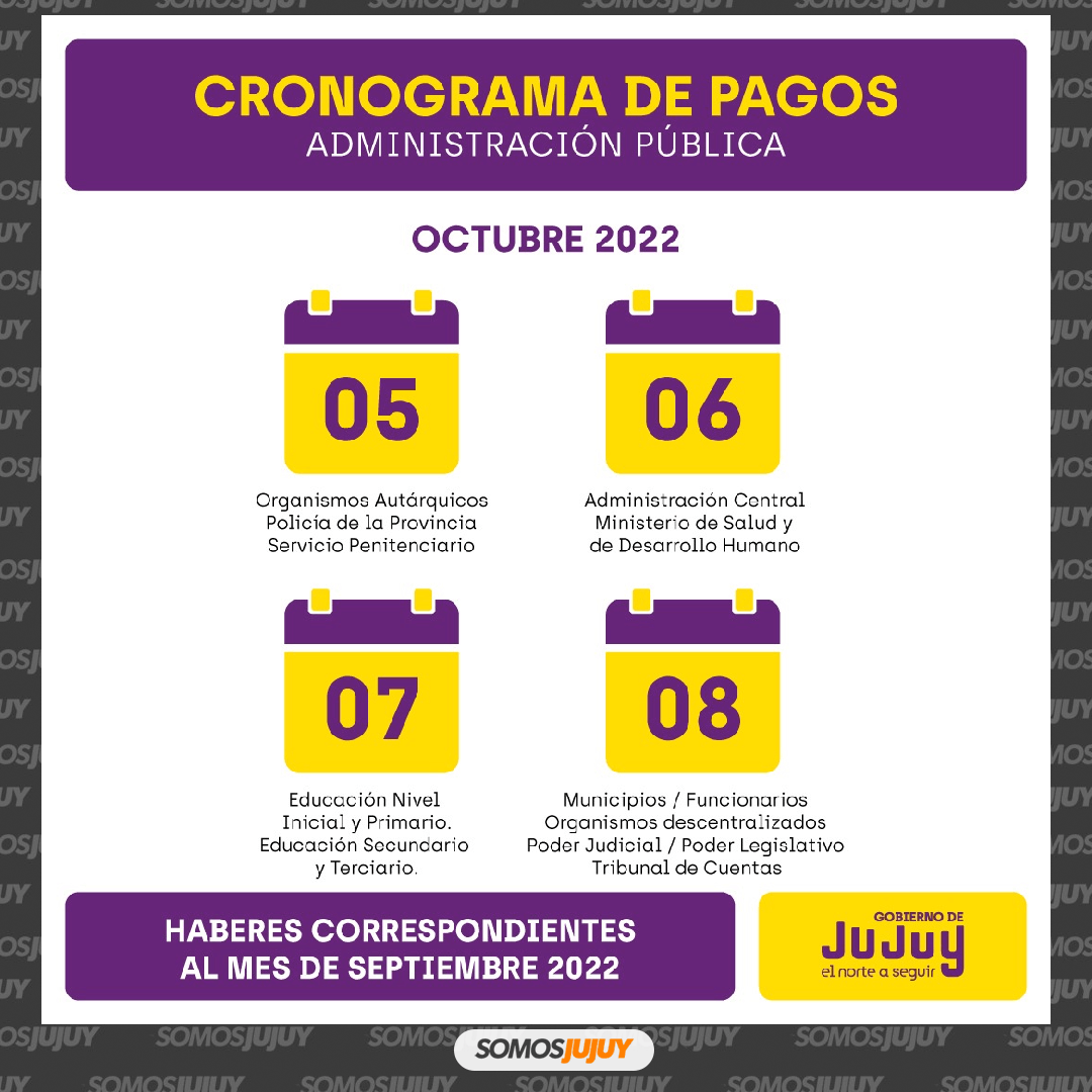 El Gobierno de Jujuy anunció que este miércoles 5 de octubre inicia el cronograma de pago para los empleados de la administración pública de la provincia.