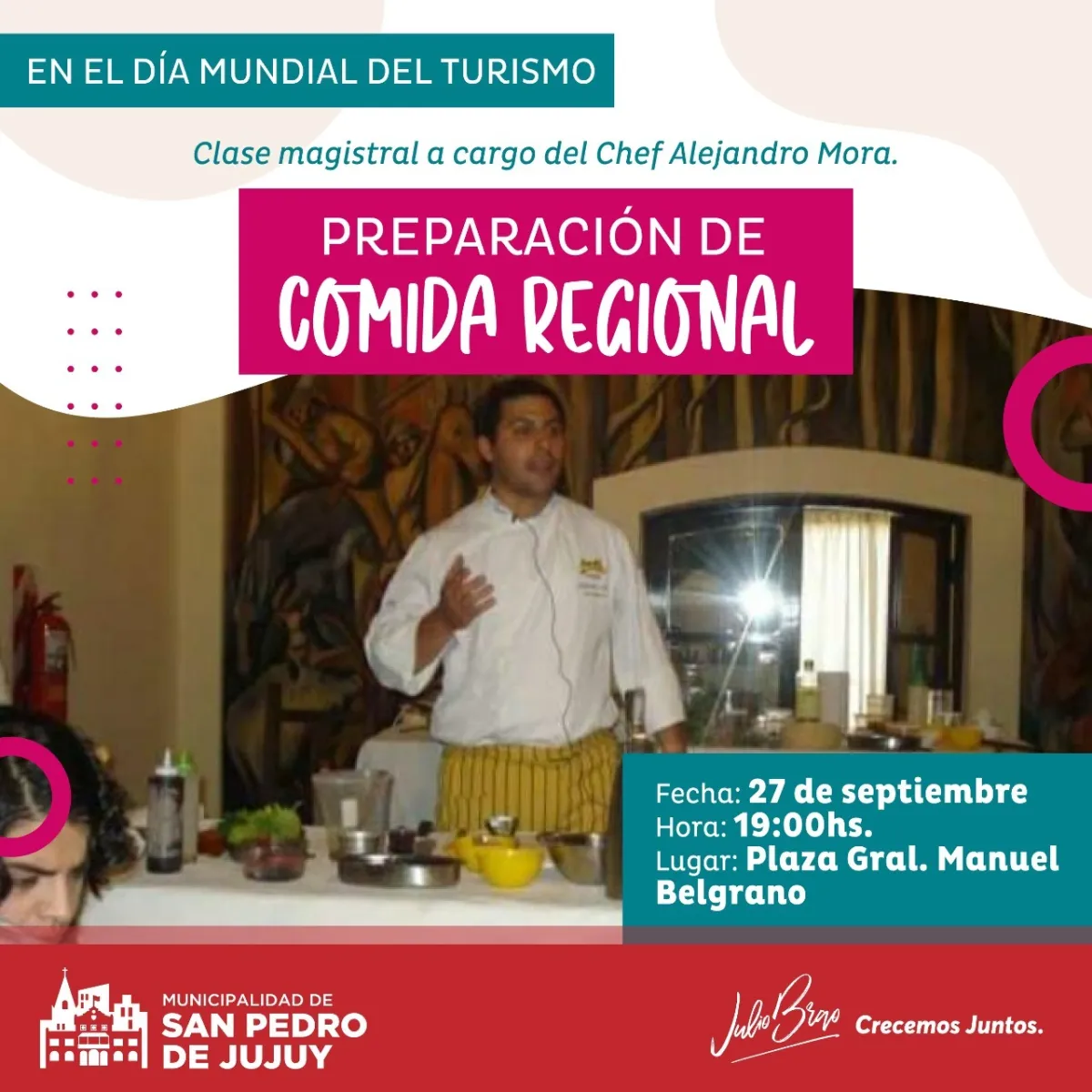 - 19:00 hs.: Clase Magistral de Cocina Regional en vivo a cargo del Chef Alejandro Mora.