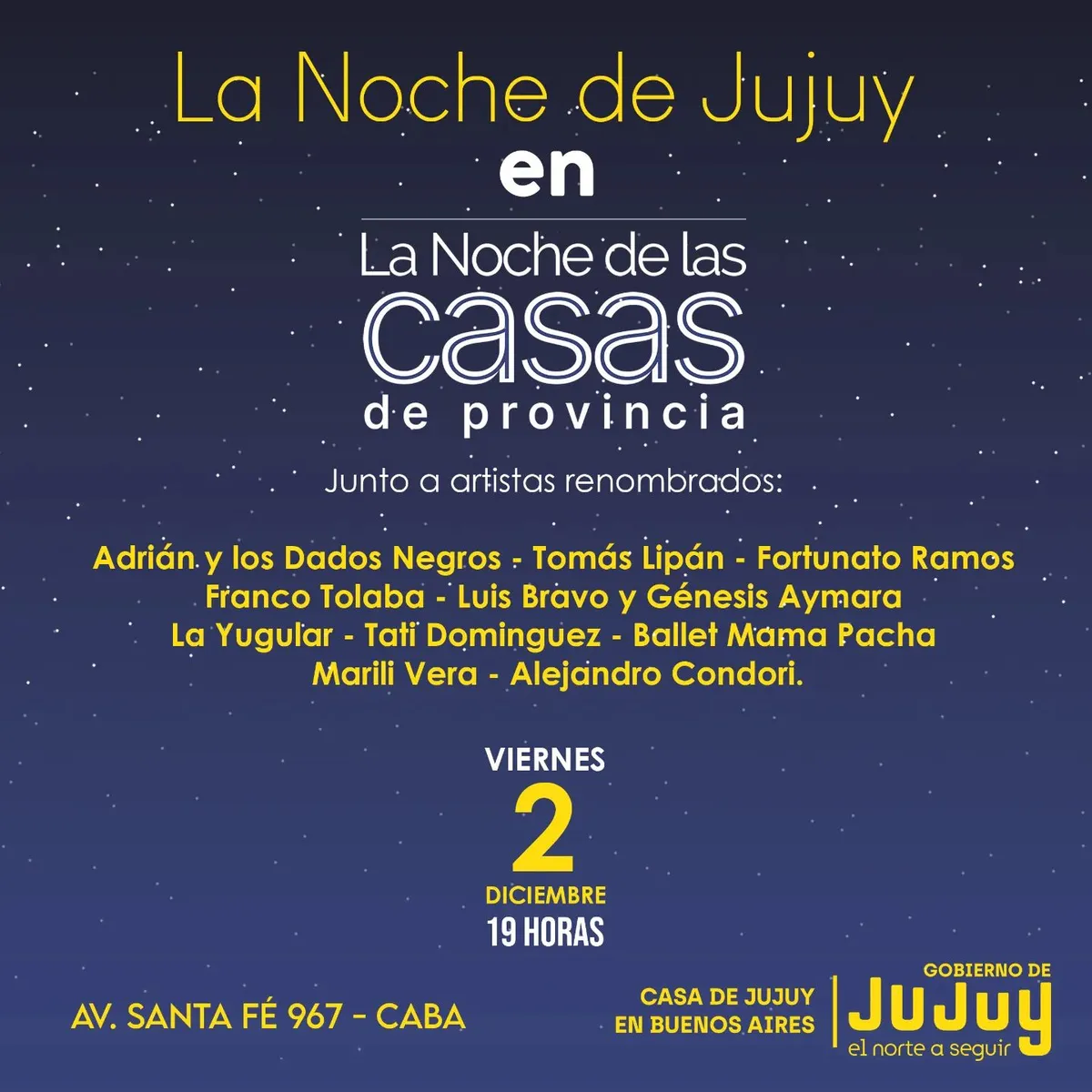 La representación oficial de nuestra provincia en CABA participará activamente de la Noche de las Casas de Provincias. El evento tendrá lugar el viernes 2 de diciembre. Comenzará a las 19 horas con un espectáculo denominado “La Noche de Jujuy”.