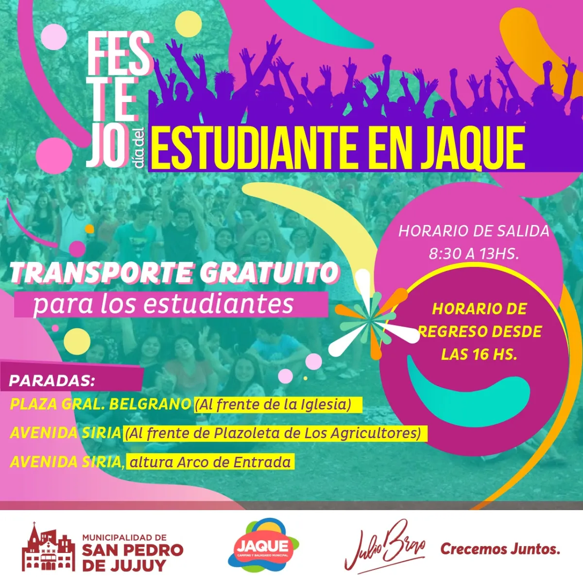Además se pondrá a disposición colectivos para el traslado de los jóvenes estudiantes, desde las 8:30 hasta las 18:00 hs. Los puntos de parada estarán en: la Plaza Central (Frente de la Iglesia); en el acceso sur sobre la Av. Siria al frente de la Plazoleta de los Agricultores y sobre la altura del Arco de Entrada.